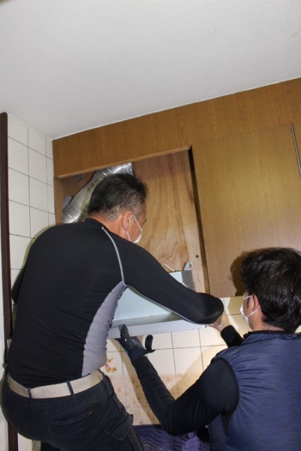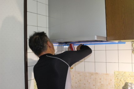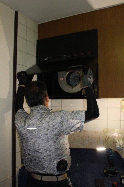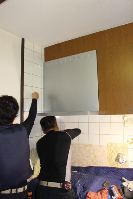 続いて新しいレンジフードの本体を固定していきます。この作業は、2人で協力して行ないました。