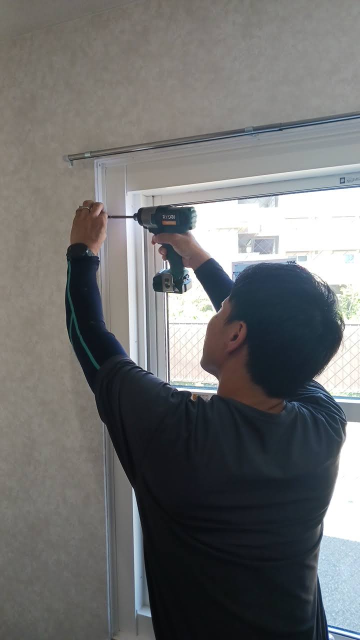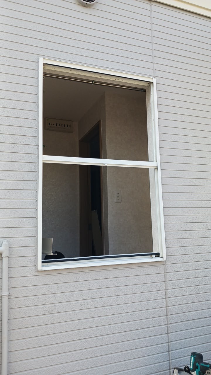 こちらは施工中の写真になります。カバー工事は、既存の窓枠を撤去せずに窓のお取替えをする施工方法です。新設枠を既存枠の中に取付する為、既存の窓の障子部分(窓の開け閉めする部分です)を撤去します。