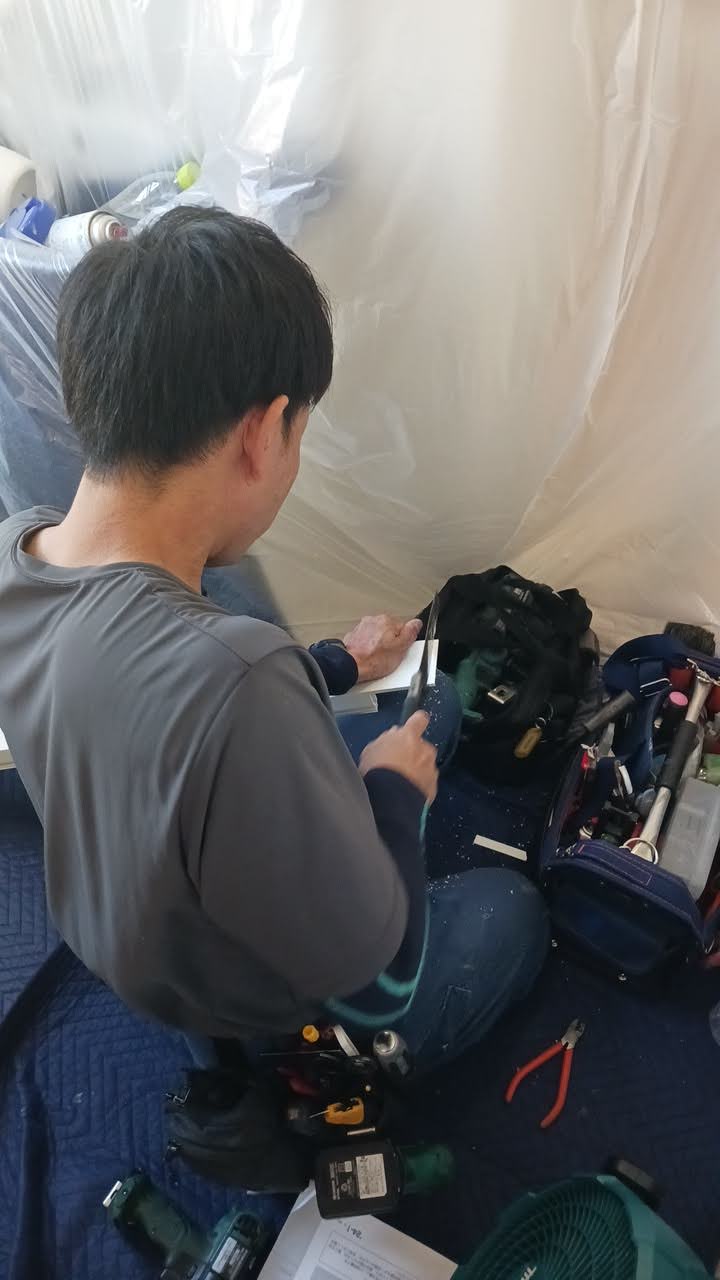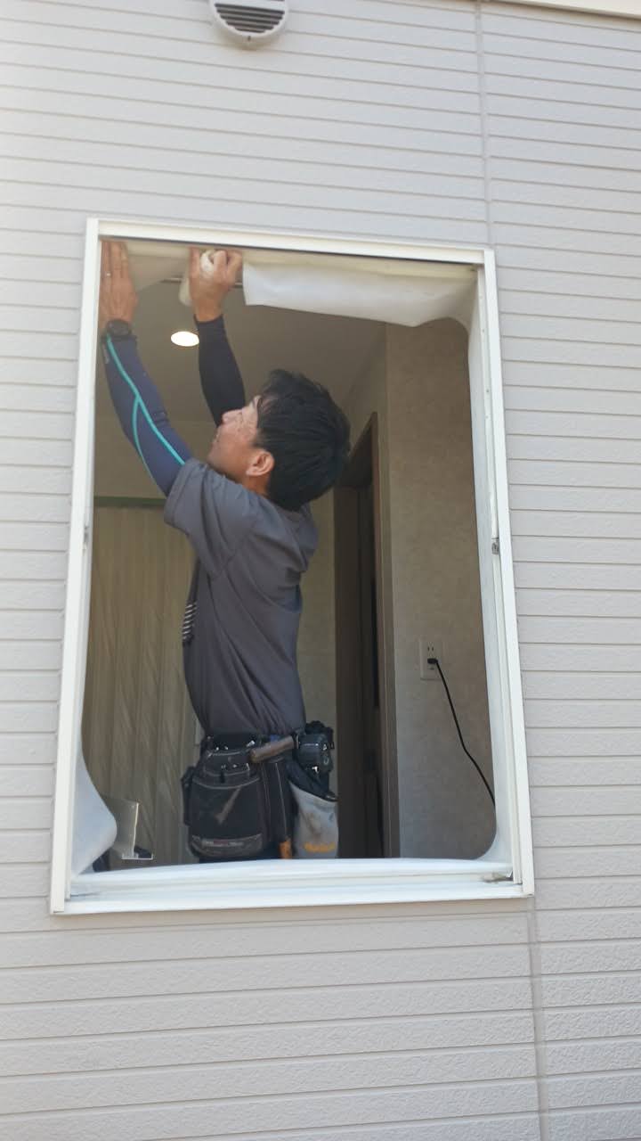 既存の邪魔になる物が撤去出来たら、既存枠に防水シート貼っていきます。既存枠と新設枠の間をこの防水シートで塞ぐことで、窓から雨漏れを防ぎます。