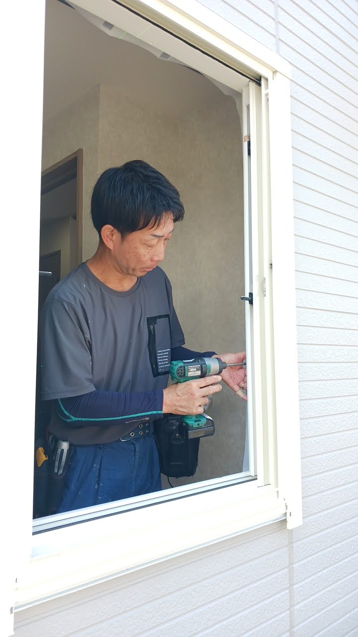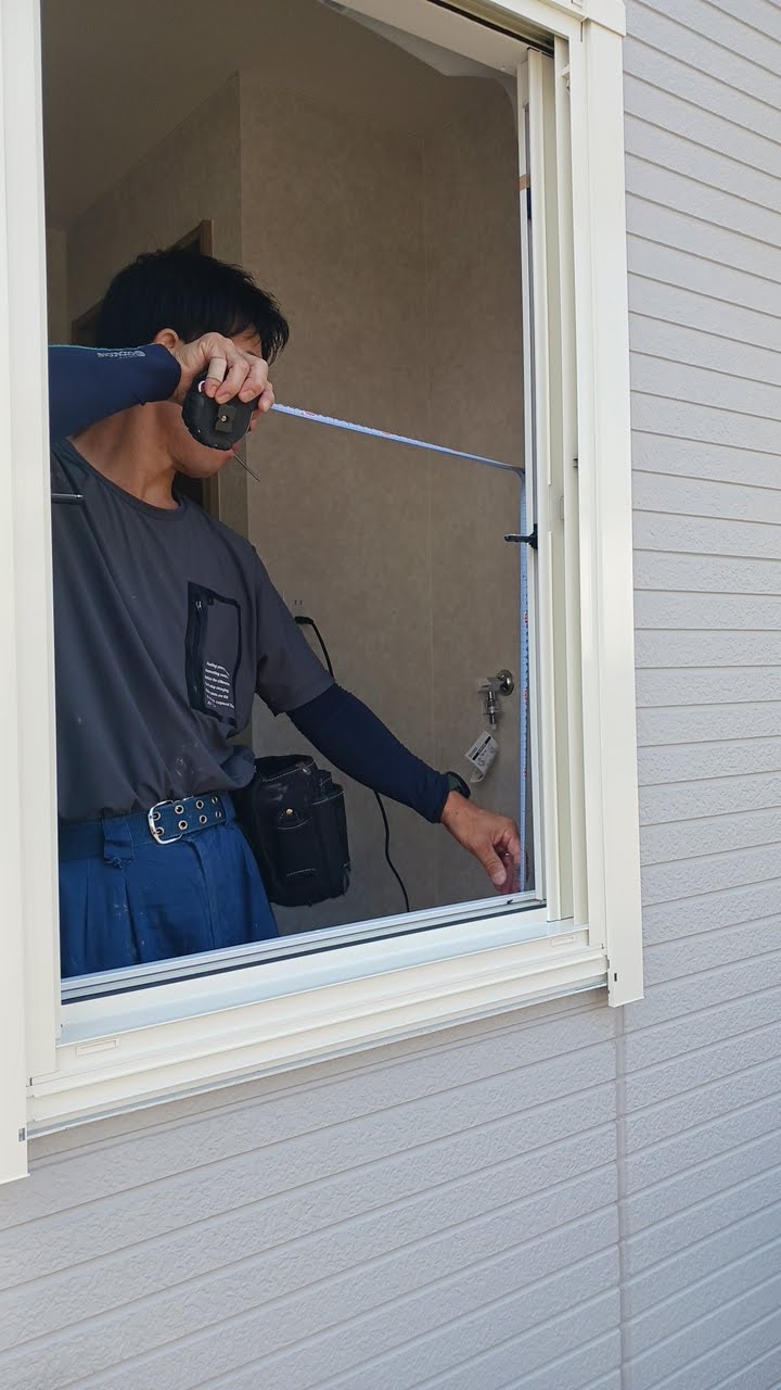 新設枠を取り付ける時には、窓枠に歪みがないように水平、垂直を確認しながら取り付けていきます。