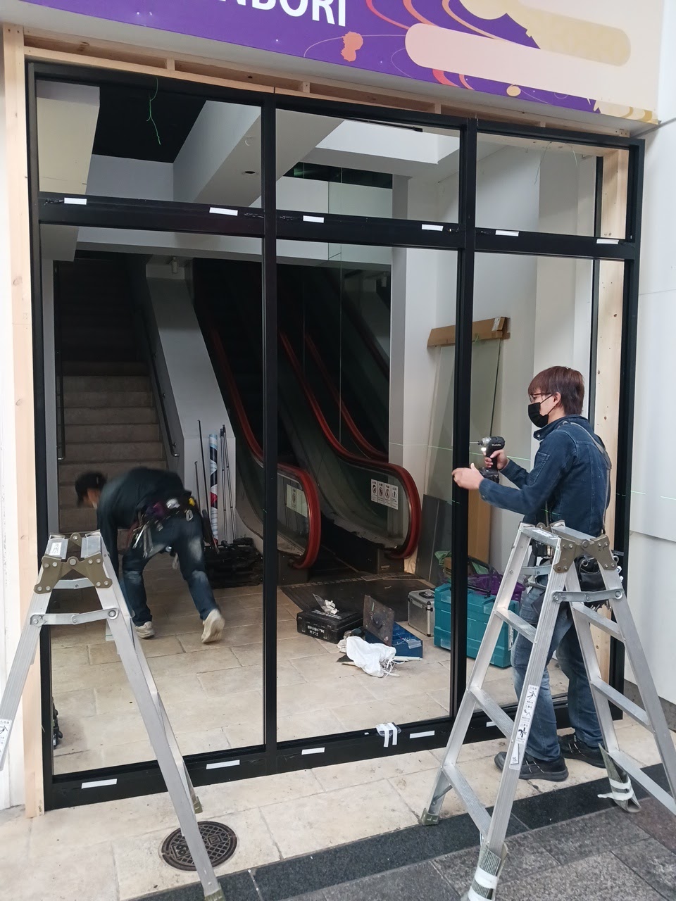 今回はアルミフロントFixをお取り付けさせて頂きました。アルミフロントとは、店舗の入り口などによく使われているアルミサッシのことです。店舗ですので、大きなガラスは2m以上あります。大きなガラスの後ろにLEDの広告が来るそうです。