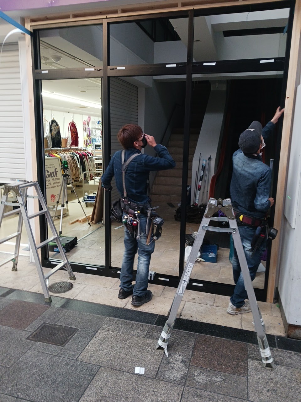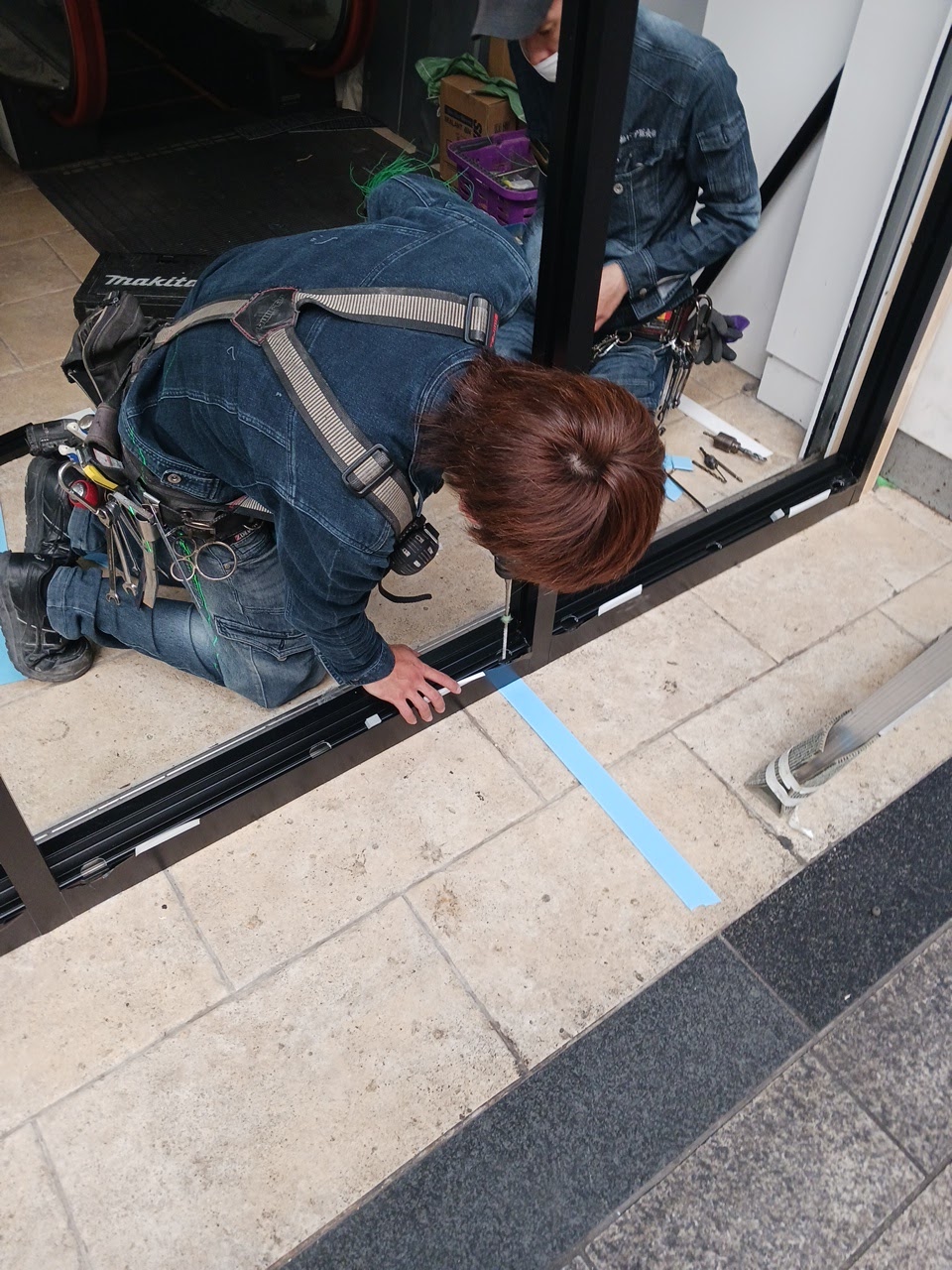 下枠は、土間に直接固定致しました。枠の固定ができたら、最後にガラスを入れてコーキング処理したら、完成です。今回は大きなガラスでしたので、飛散防止フィルムを貼りました。万が一割れてもガラスが飛び散らないように配慮しました。店舗用サッシのお悩みは、ぜひ弊社にご相談下さい!お見積もり、現場調査は無料です!!