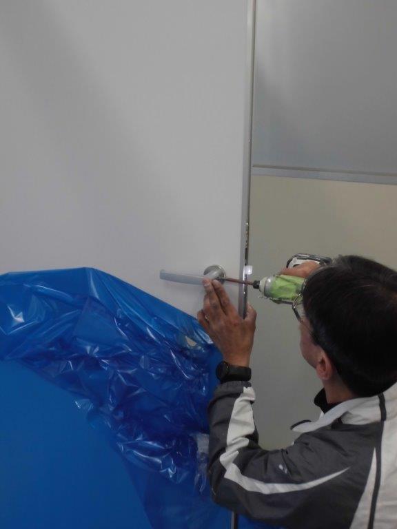 施工中⑨ドアのレバーハンドル錠を取付しています。この後ドアクローザーも取付します。