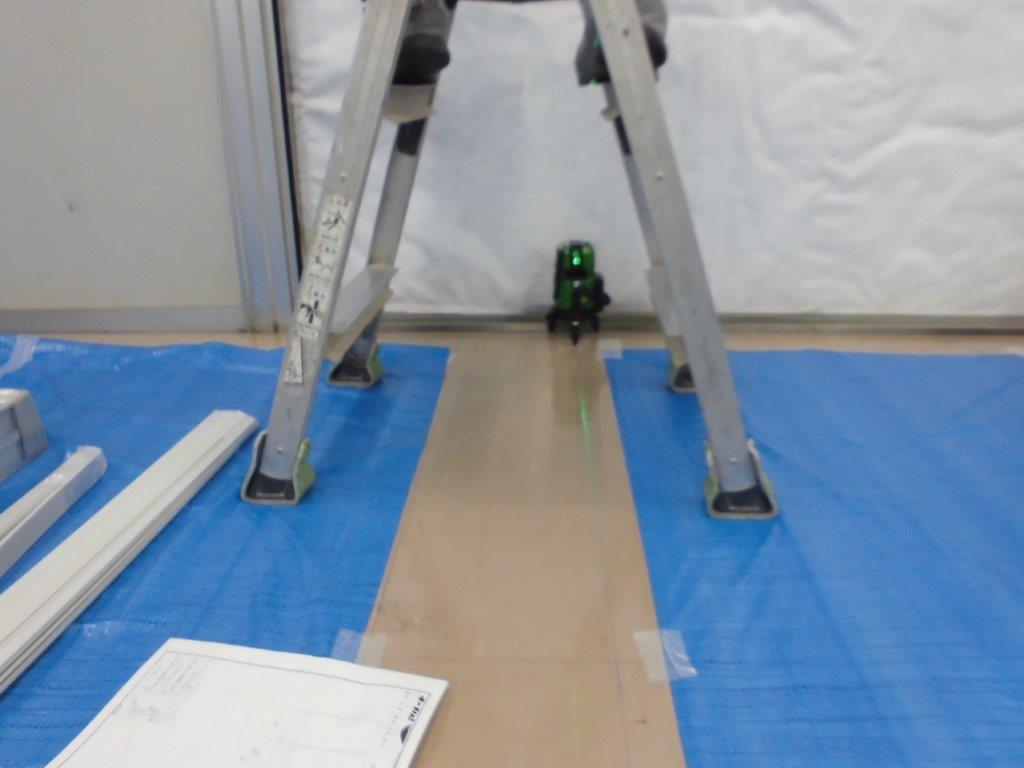 施工中②レーザー墨出し器を使用し新設パーティションの取付位置を確認します。垂直に歪みの無いように計測し、床と天井に取付するベースプレート位置に墨付けします。