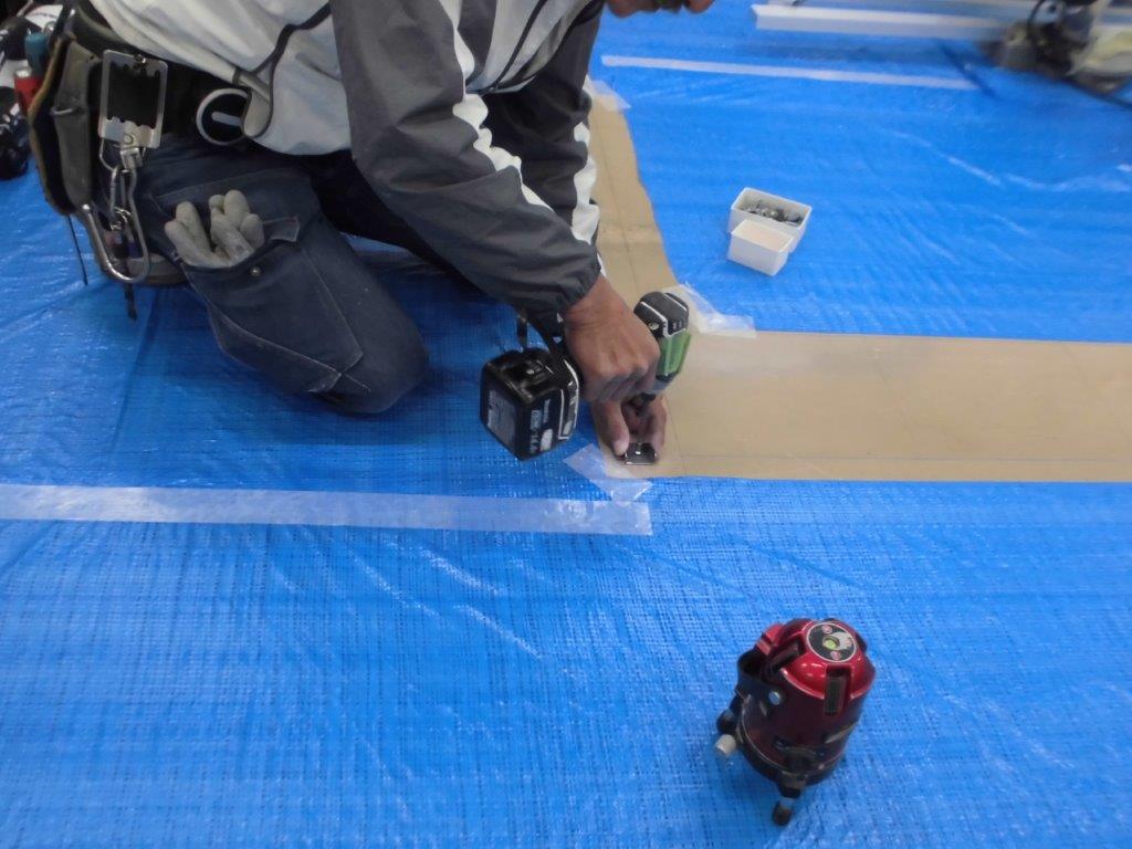 施工中③墨出しした床に振動ドリルを使用し下穴をあけ、その穴にアンカーを入れてベースプレートを設置電動インパクトドライバーでビス止めします。