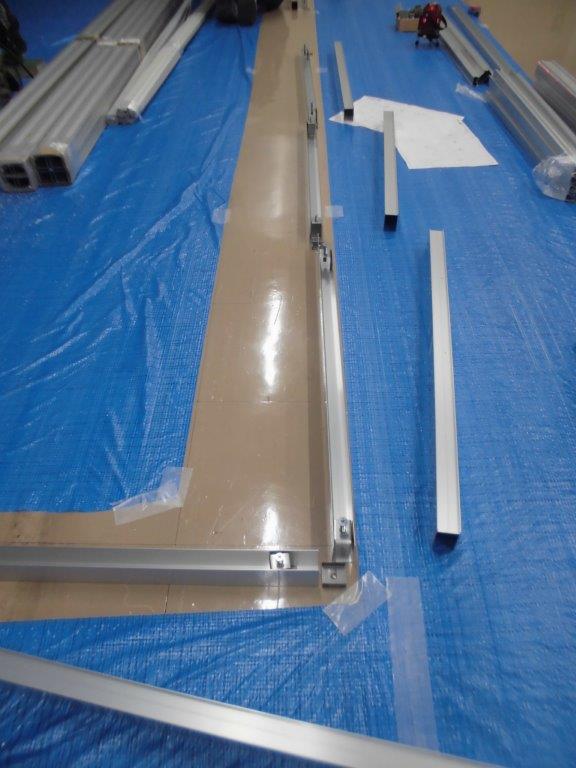 施工中⑦パネルの取付が完成しましたら、硝子部3カ所に型板硝子をはめ込み固定します。