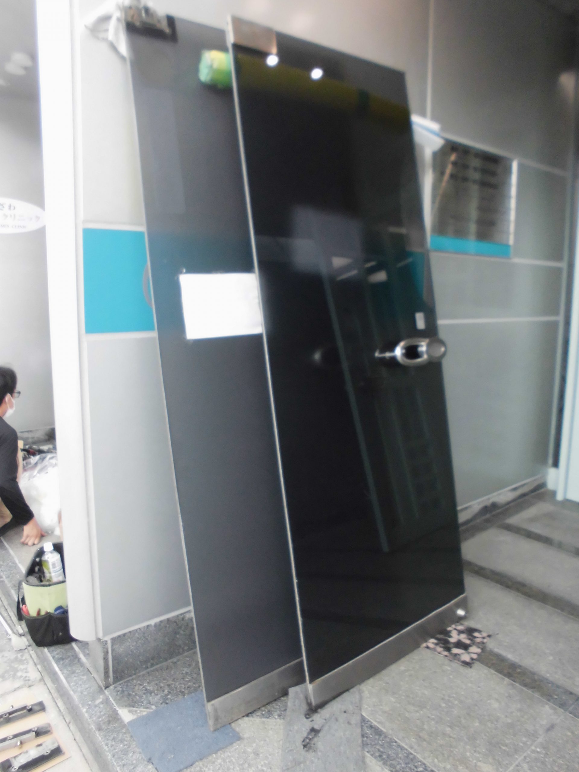 吹田市 LIXIL製クリエラガラスドア(アルミ框ドア)レバーハンドル錠仕様取付例です。