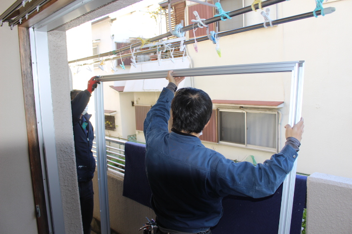 吹田市のお客様より賃貸マンションの掃き出しサッシの交換をご依頼いただきました。築40年程のマンションでしたが掃き出しサッシの開閉がしにくくなっているのと隙間風が入り、冬寒いとのことでした。そこで当社が得意とするおススメのサッシカバー工事をご提案しご採用いただきました。1日でサッシが新品になり、今のサッシは気密性が数段上がっているので隙間風も音も静かになります。
