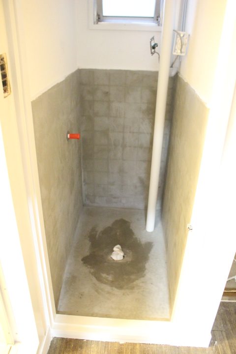 古いトイレの便器やタンクを撤去し、壁と床のタイル面を左官工事で下地処理します。(私たちはこの作業を「左官でしごく」と言います)