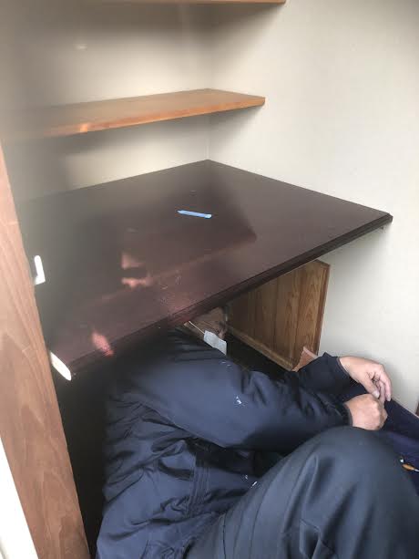 改修工事がスタートしました。まず、壁にアルミのLアングルを固定し、そこの上にテーブル板を固定しました。その後、水道の職人さんが、テーブル板に穴を開け、水栓と洗面ボウルを設置しました。