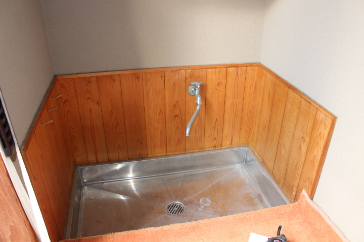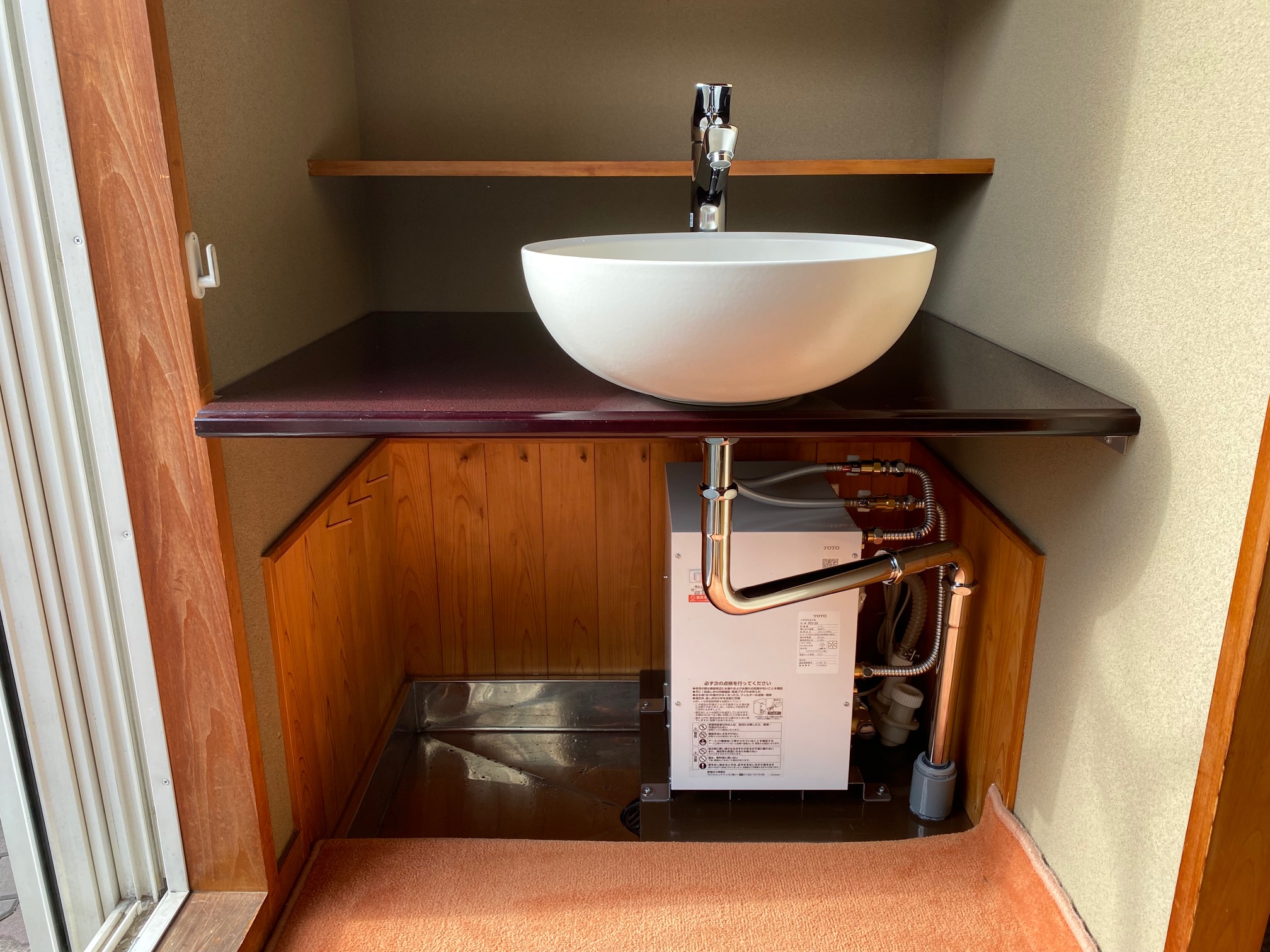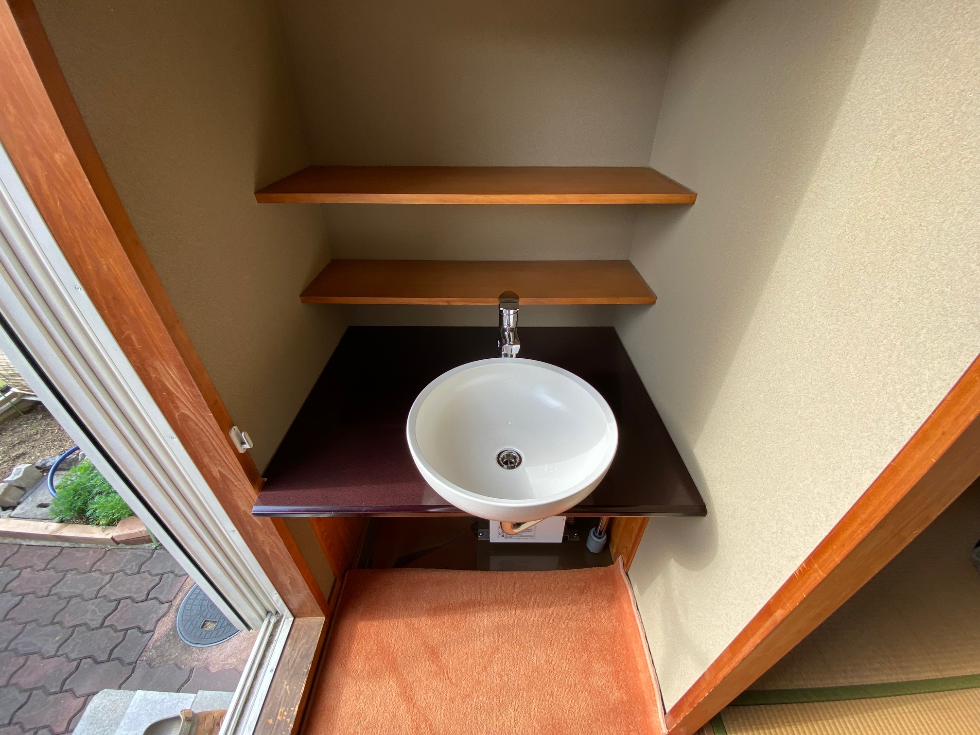 吹田市のお客様よりご自宅の和室の縁側に茶道のお茶をする際に使う水場があるのですが、そこを簡易の洗面台を作って欲しいとのご依頼をいただきました。カウンターを新設し、水栓と洗面ボウルを設置し、電気温水器も設置しました。打合せでお客様のイメージをお伺いし、改修させていただきましたが、イメージ通りに出来、お客様も、これでお庭で作業された際に、すぐに手を洗ったりできるので便利になるとのことでした。