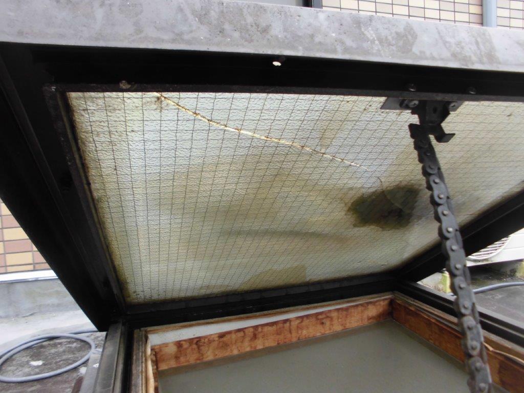 施工前 内側の写真です。網入り硝子がひび割れています。この様に外部側アクリル板、内部側網入り硝子の両方とも破損しています。このままでは天窓下1Fキッチンに雨が侵入してしまう状況でしたので、硝子とポリカーボネート板(アクリル板より上部で破損し難い)に取り換えます。