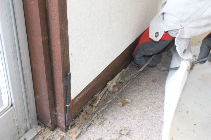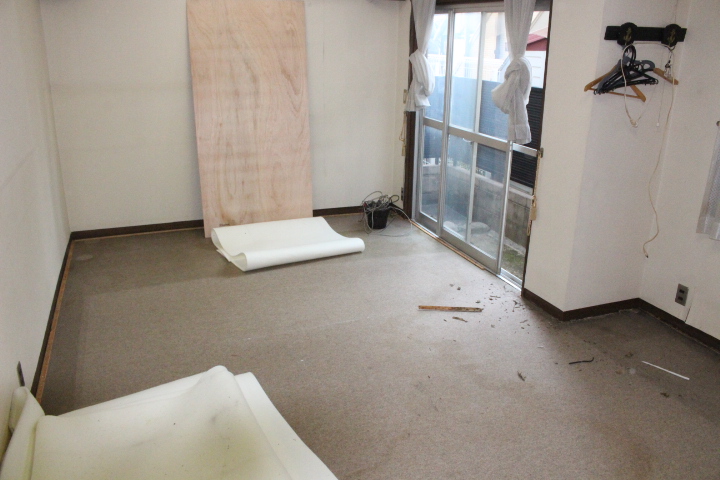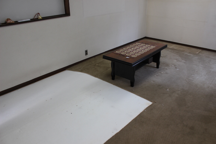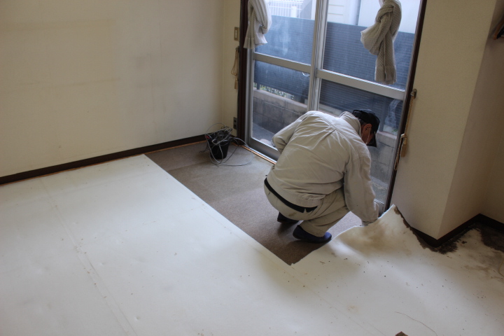 リフォーム工事は、古い床の絨毯の撤去からスタートです。カッターで90cm×180cmぐらいに切っていき撤去していきました。白い部分が下地のクッション材です。こちらも続いて撤去していきます。