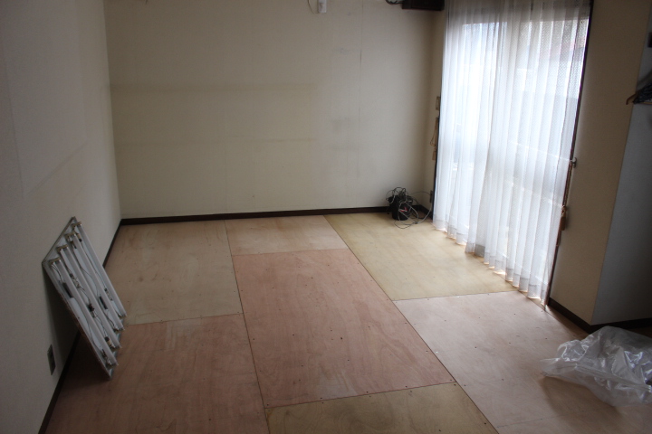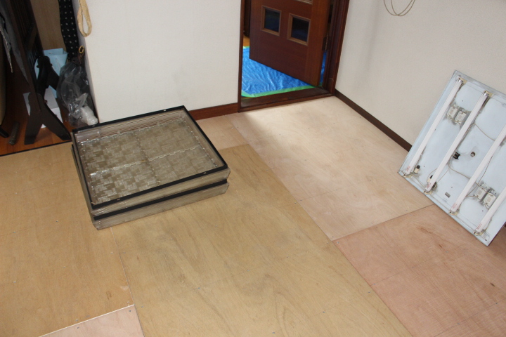 クッション材の撤去が終わると、次に床に下地の合板を施工していきました。厚さ12mmの構造用合板を張っていきます。