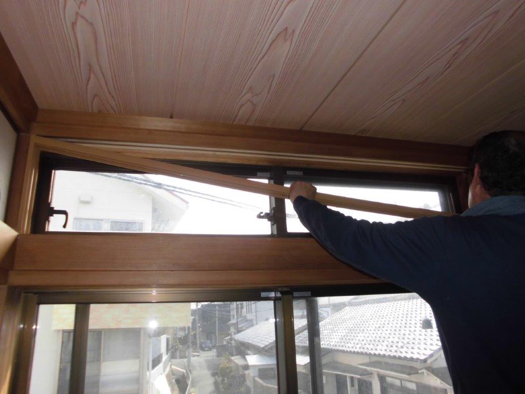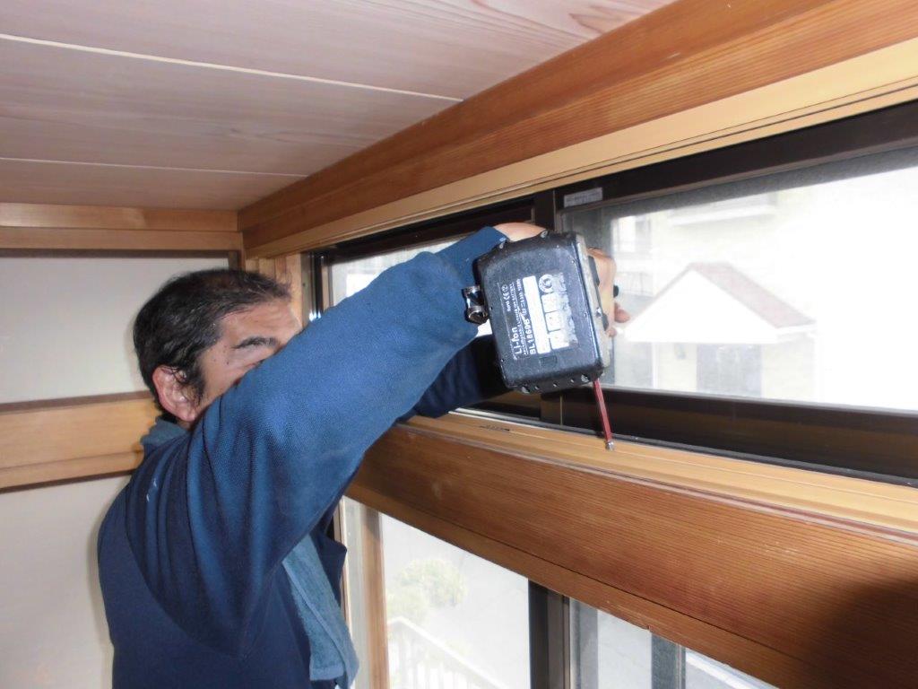 施工中① ランマ部の小さい窓から内窓プラマードUを取り付けていきます。事前に採寸オーダー製作したプラマードUの枠を電動インパクトドライバーでビス止めしていきます。写真は内観右側の縦枠を取り付けている所です。その後、左側の縦枠もビス止めしていきます。