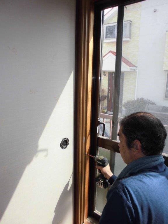 施工中④枠のビス止めが完了しましたら、硝子障子を外部側、内側と2枚はめ込みます。その後、硝子障子の動作調整、クレセント錠の施錠調整確認をして完成となります。