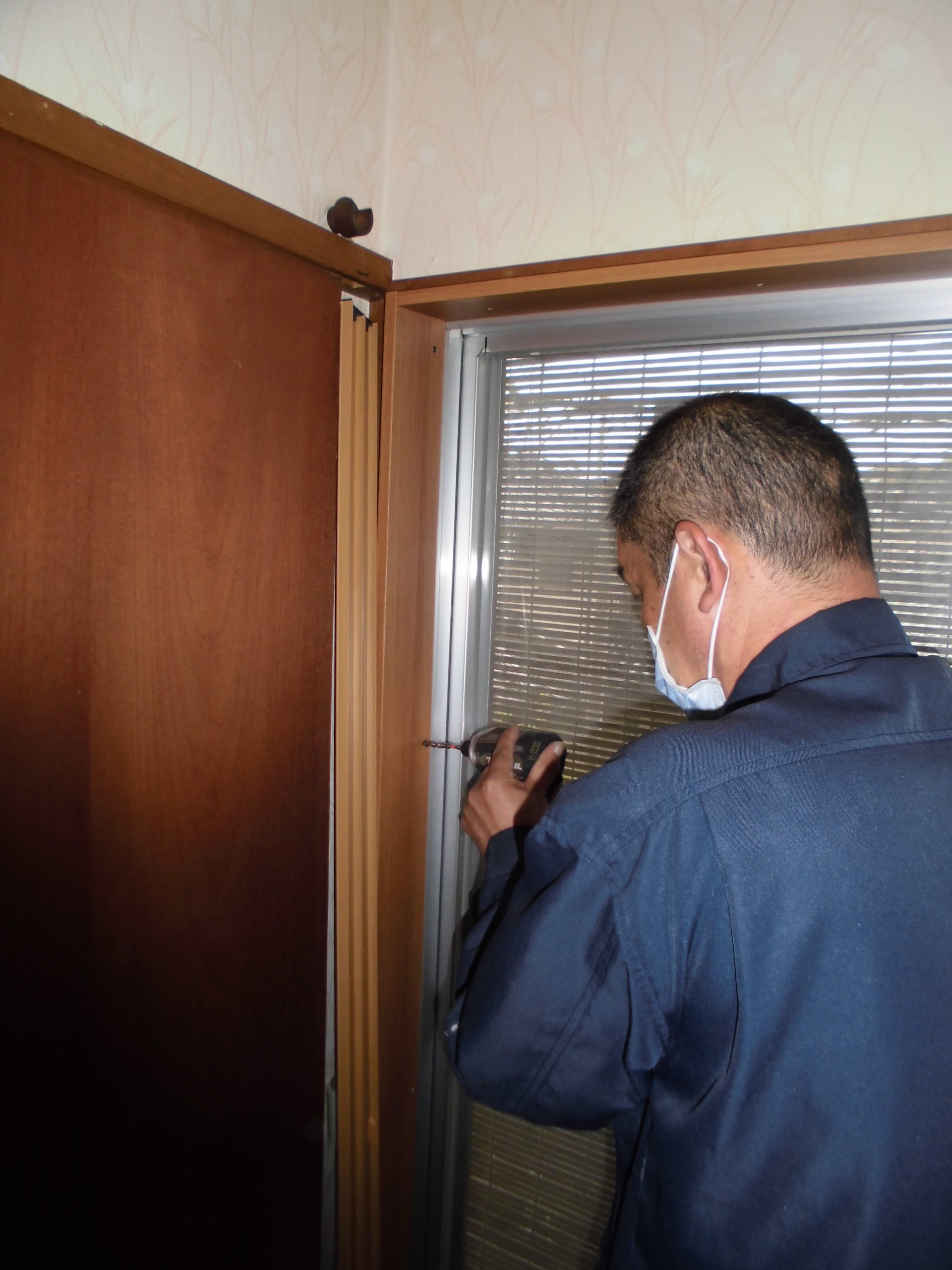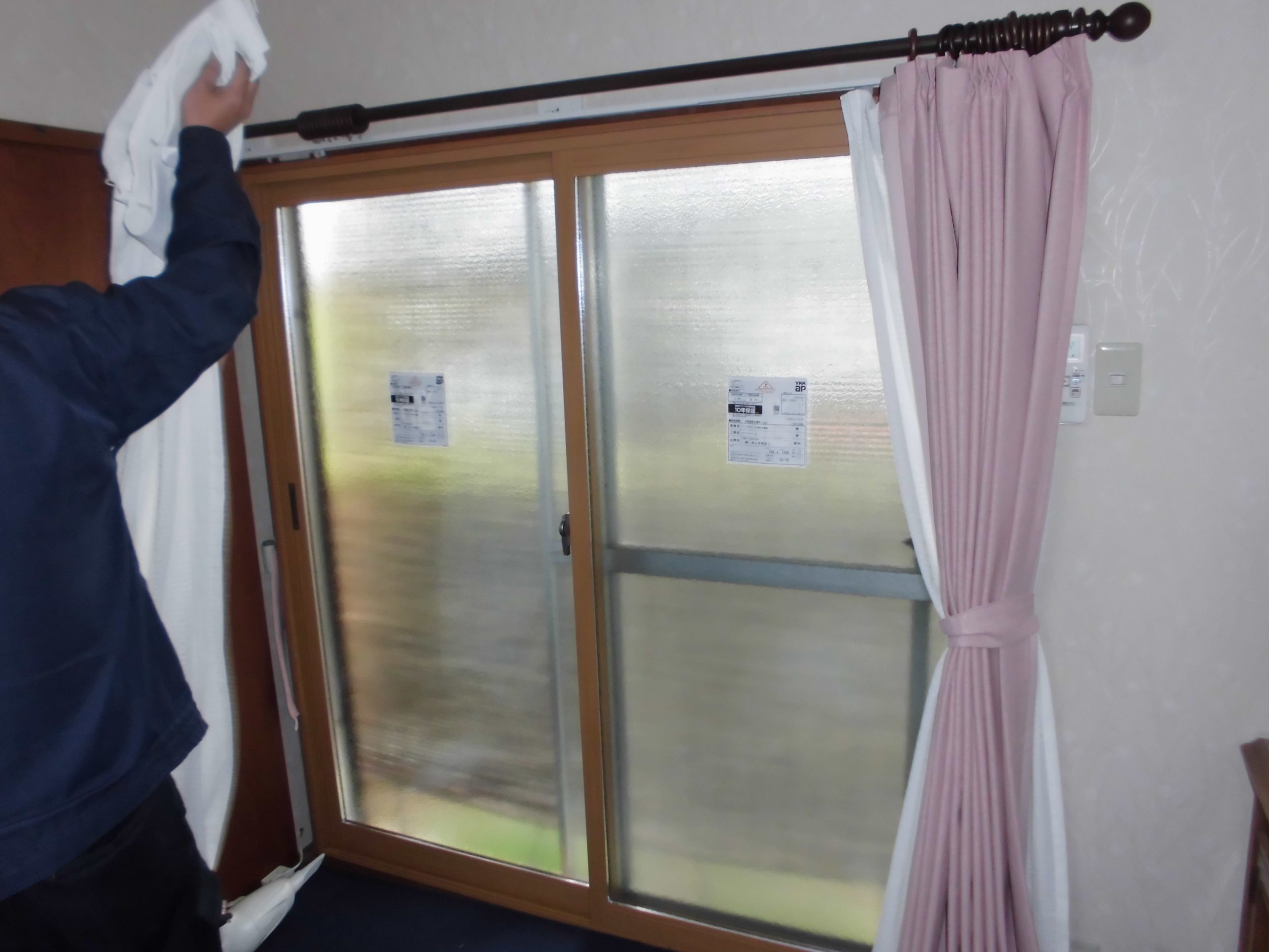 施工中⑤プラマードUの硝子障子を外障子、内障子を順番にはめ込み動作調整、施錠調整をして完成となります。