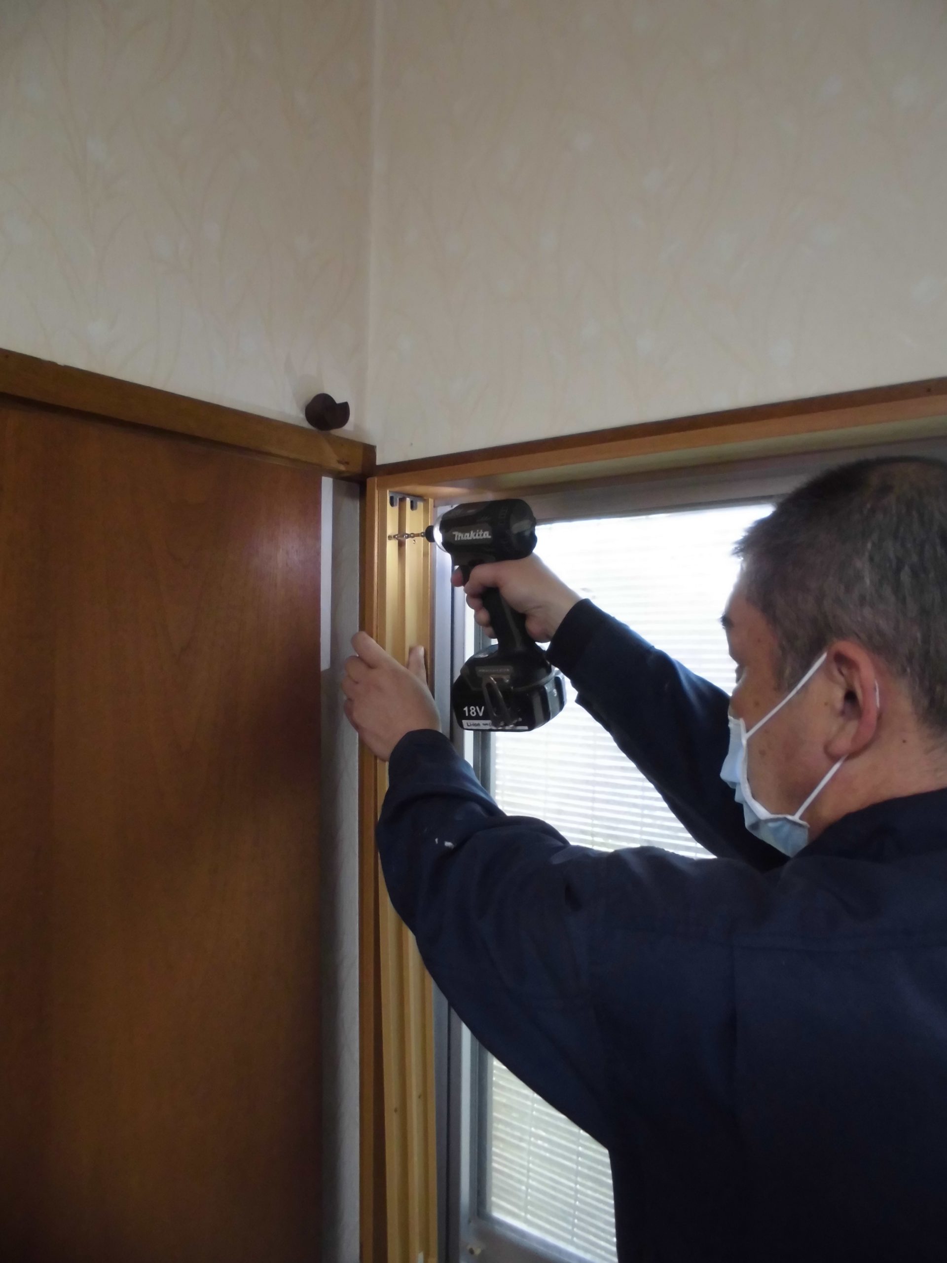 施工中③内観左の枠を電動インパクトドライバーしっかりとビス止めしていきます。左右、上下の4方枠全て同じように取付て行きます。