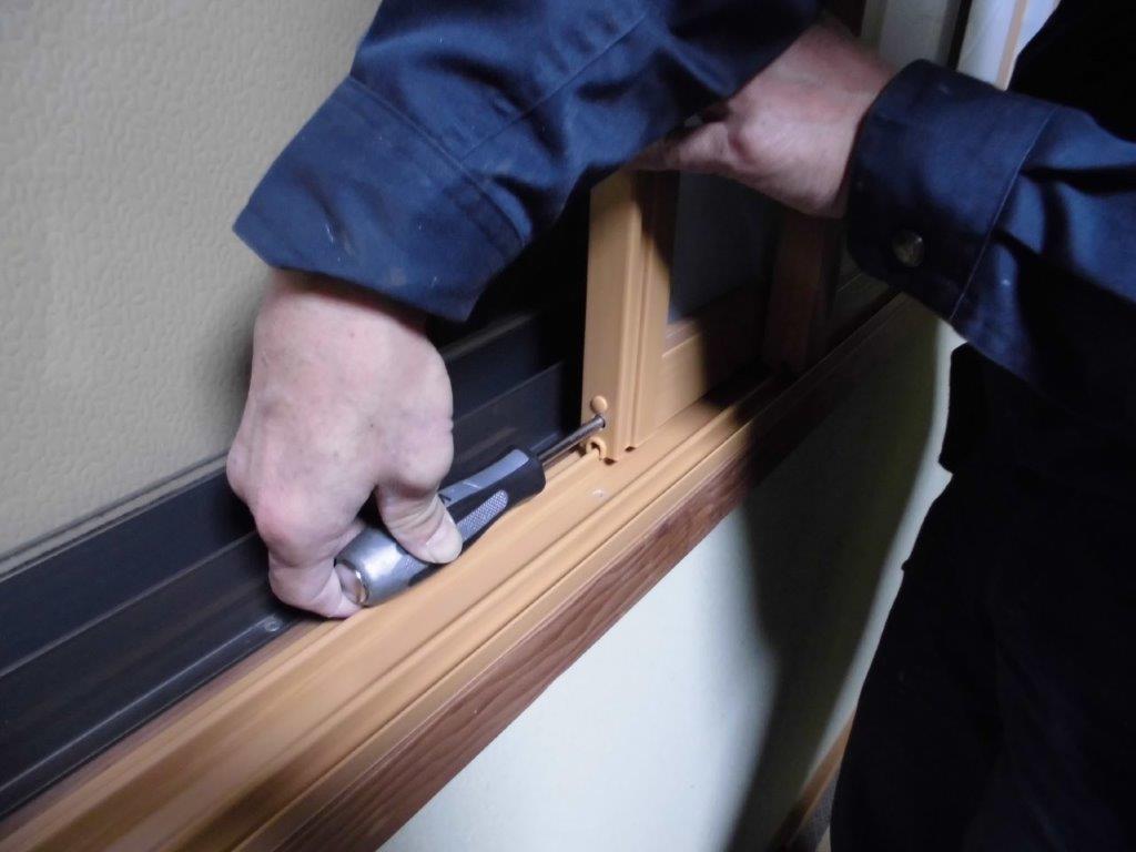 施工中⑨ 内外障子2枚共はめ込み完了しましたら、障子側面下部にある戸車調整ビスをドライバーで回転させ、閉めた時に隙間の無い様微調整します。