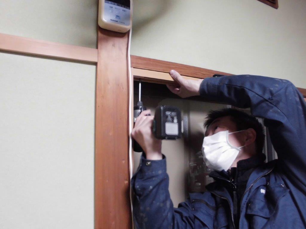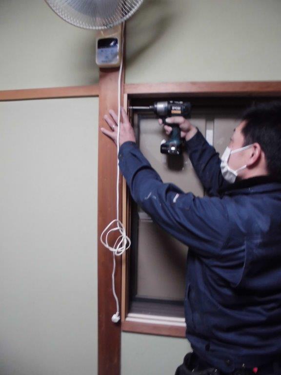 施工中③ 内観右側の縦枠を既存枠にはめ込み電動インパクトドライバーでしっかりとビス止めしていきます。