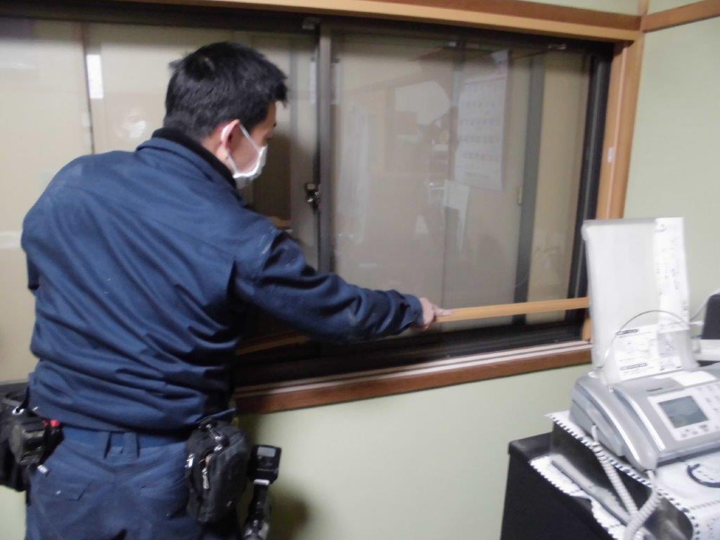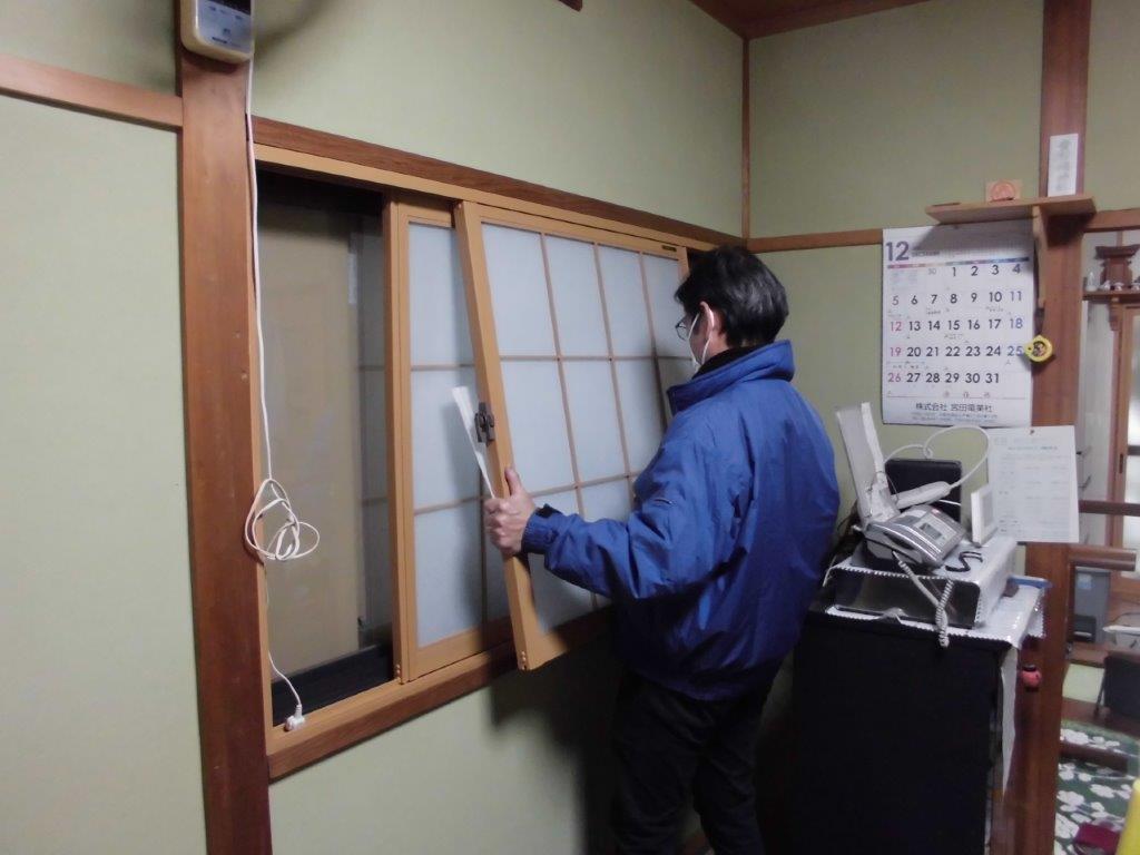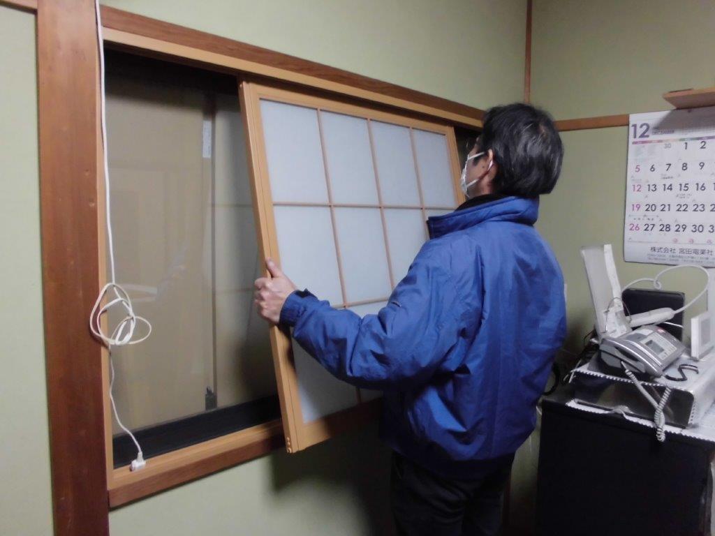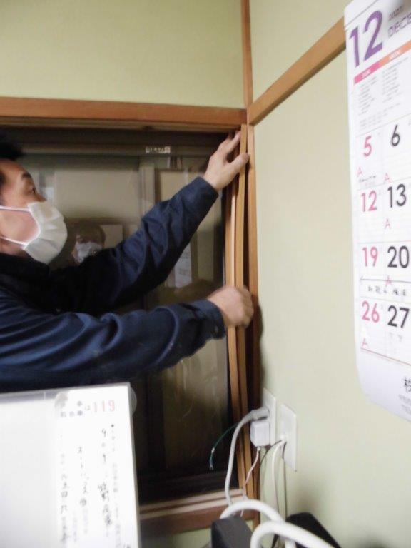 施工中⑦ 外障子を新設枠内にはめ込んで行きます。