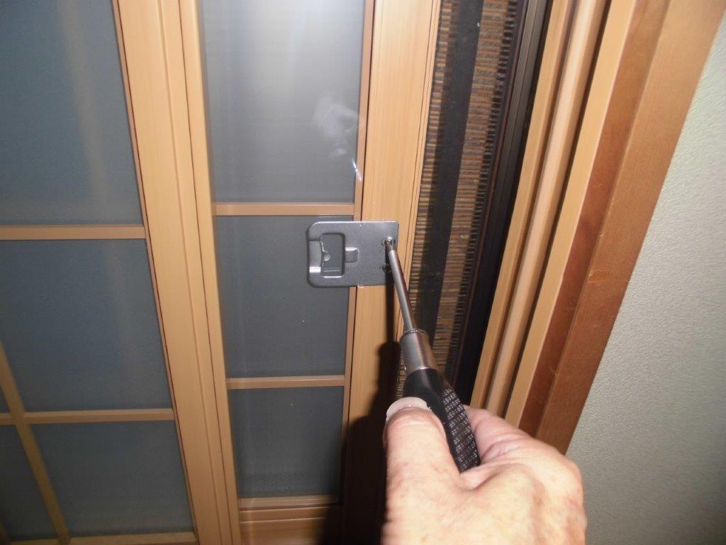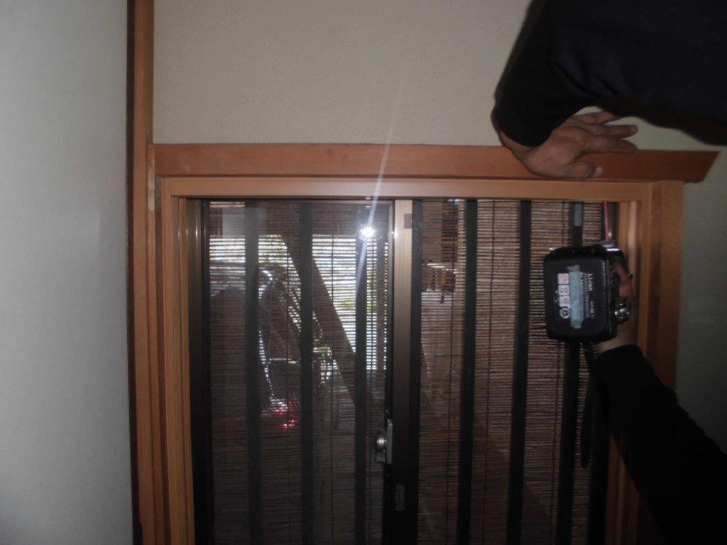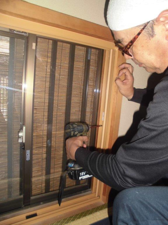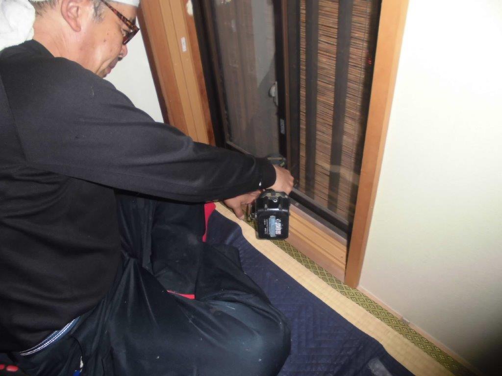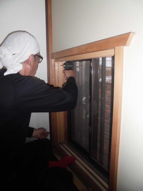 施工中①既存の紙貼り障子を取り外します。上部鴨居溝に下地材を埋め込み、敷居にも段差解消材を取り付けます。その後、事前に採寸オーダー製作したプラマードUを取付ていきます。写真は内観左縦枠を既存木枠に歪みの無いように設置、電動インパクトドライバーでビス止めしています。