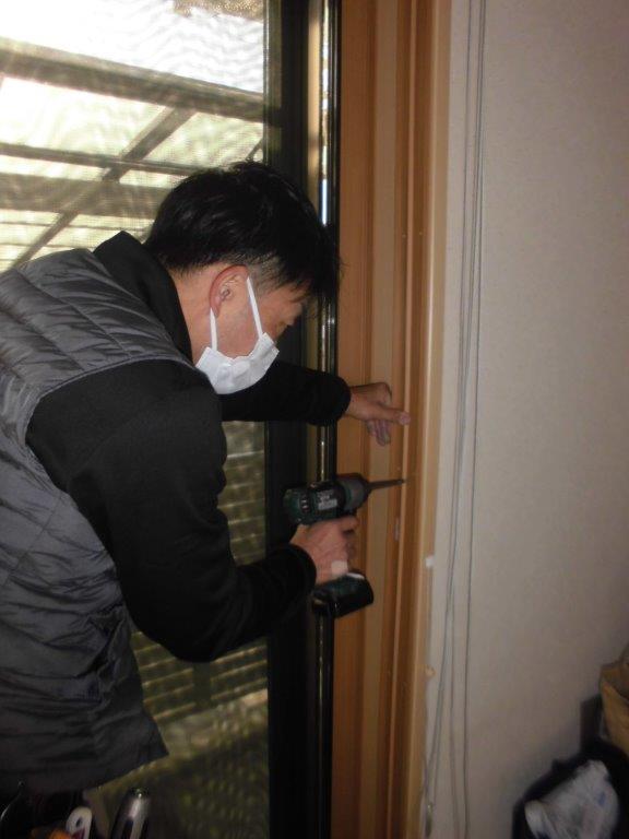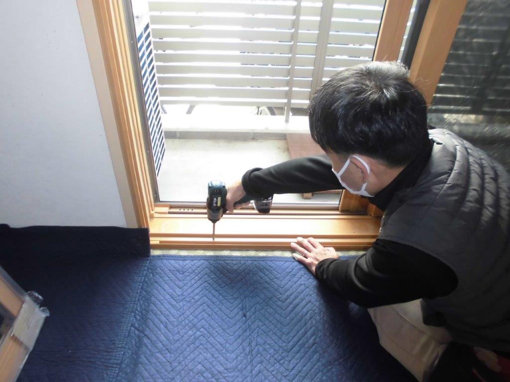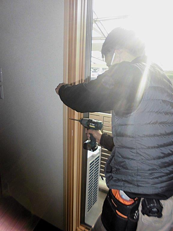 施工中⑤新設内窓の枠のビス止めが完了しましたら、硝子障子を外側からはめ込みます。