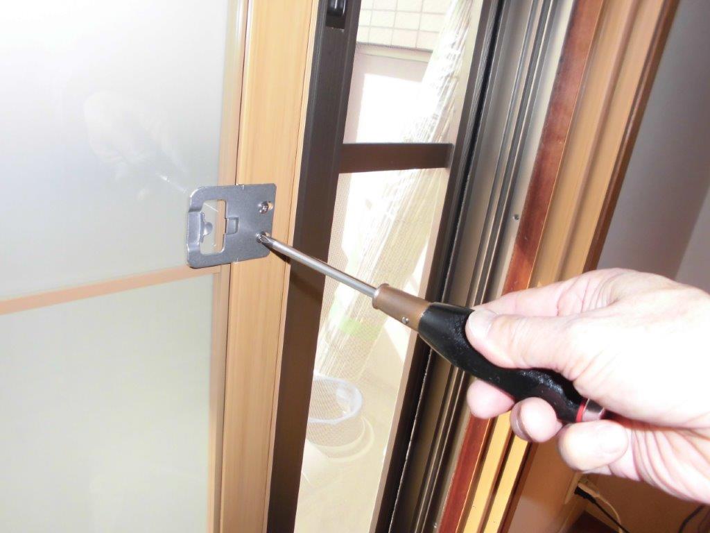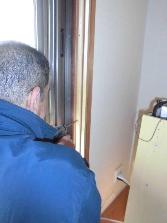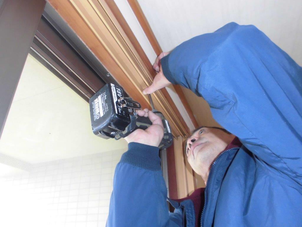 施工中⑦硝子障子2枚共はめ込みましたら、召し合わせ部のクレセント錠の調整をします。