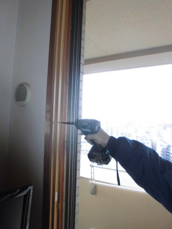 施工中②事前に採寸オーダー制作したプラマードUの枠を取り付けていきます。最初に内観右側の縦枠を電動インパクトドライバーでビス止めしていきます。